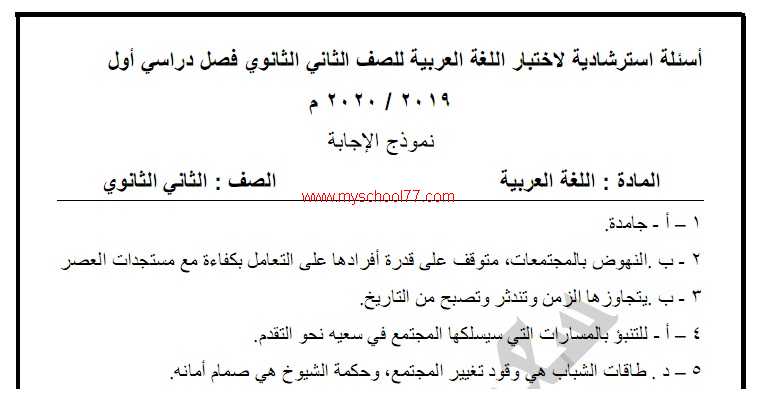 اجابة نموذج الوزارة الاسترشادى لغة عربية للصف الثانى الثانوى ترم أول 2020